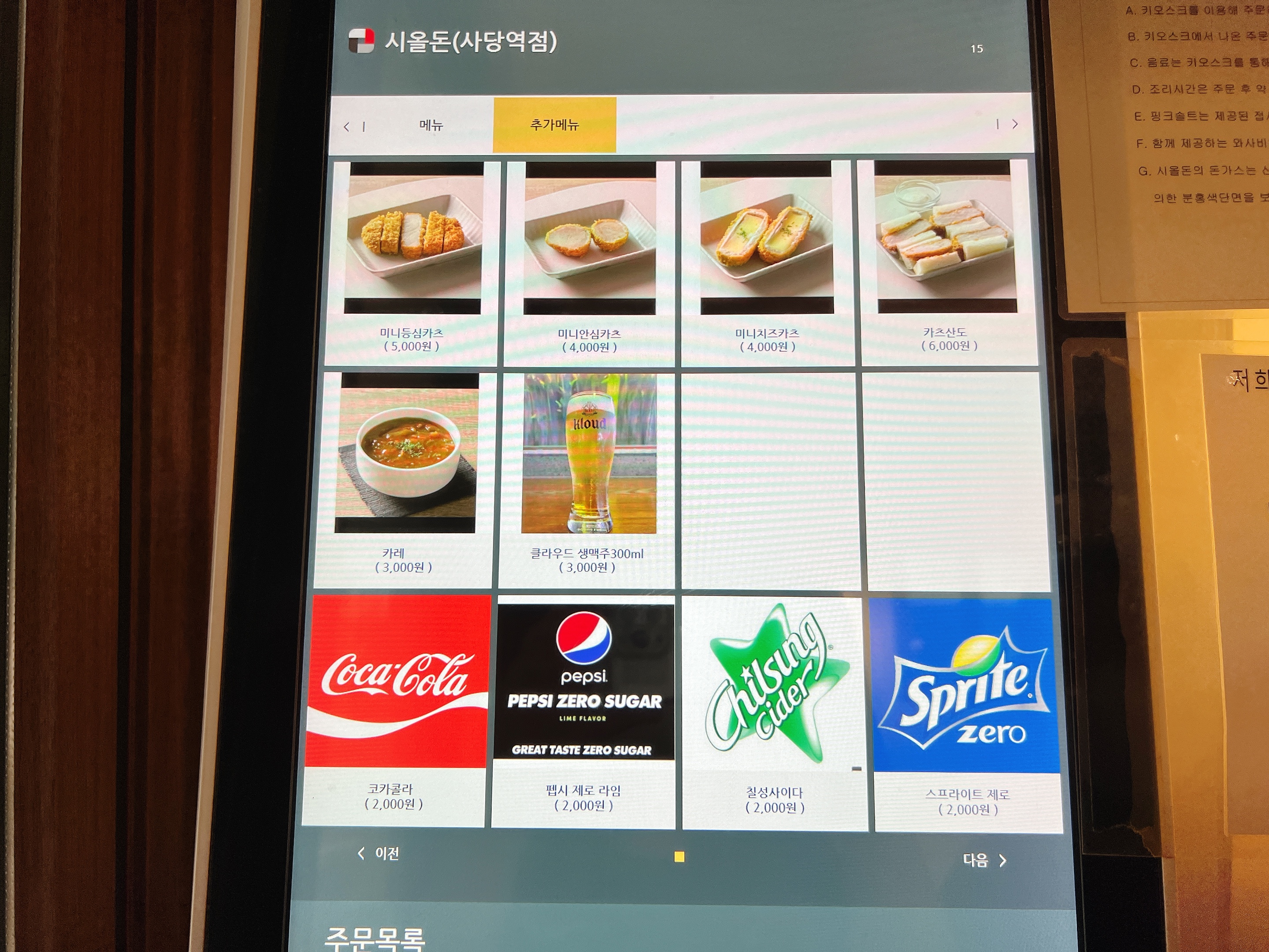 사당역 시올돈 키오스크 주문이에요
