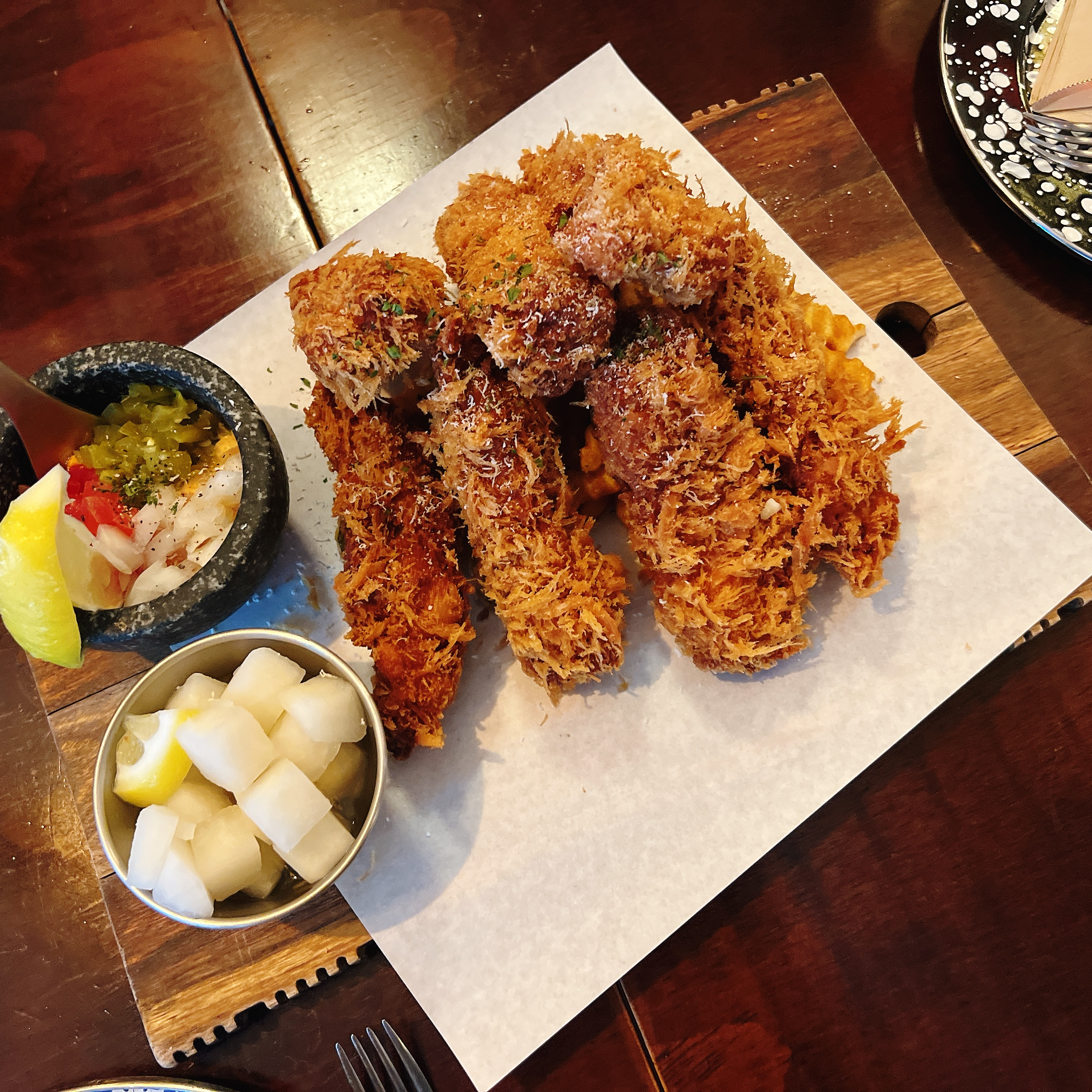 시그니처 순살치킨 !! 치포틀칠리딥,치킨무,할라피뇨튀김,감자튀김이 같이 나와요~