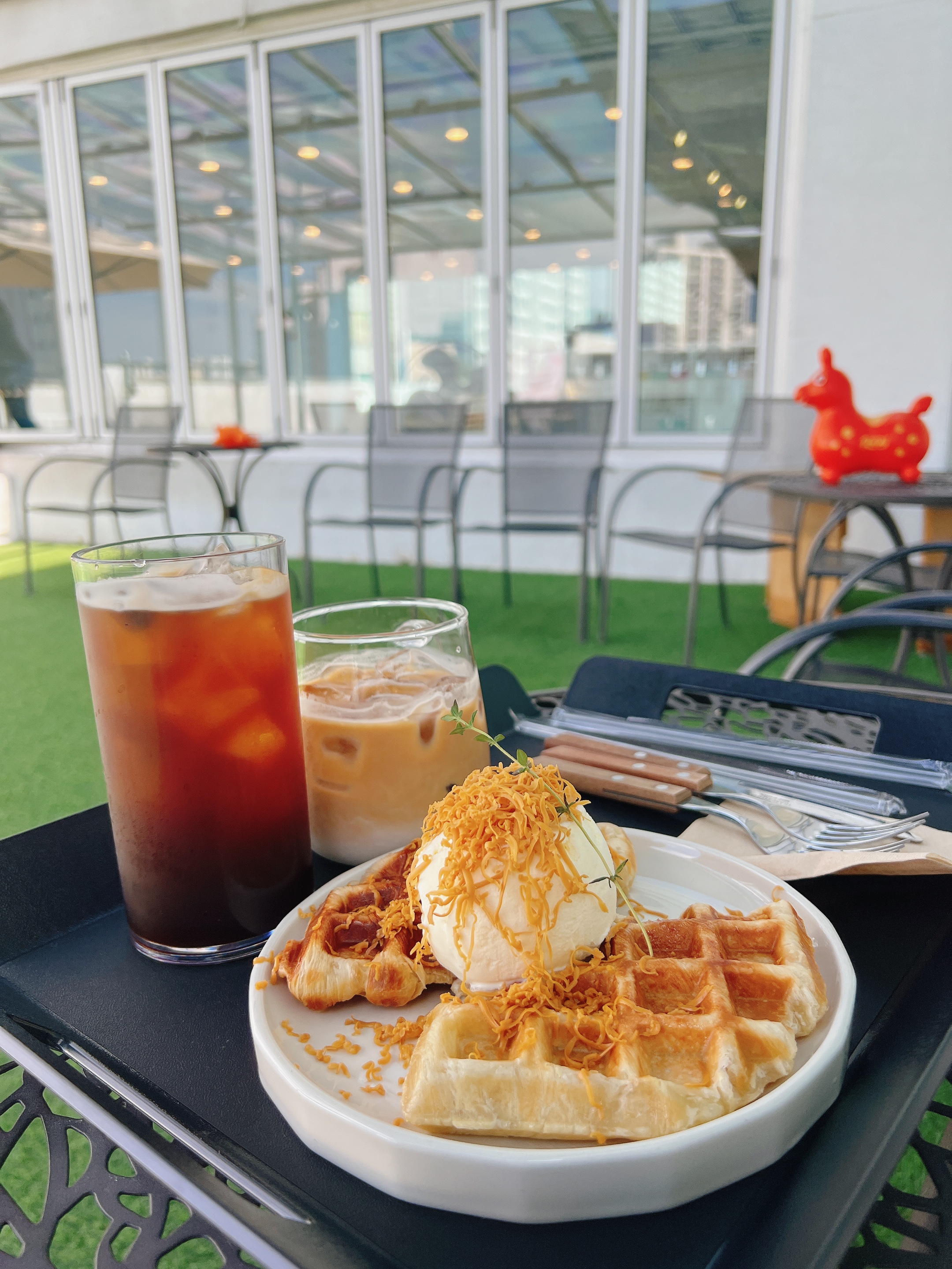 맛있는 음료,디저트와 함께 야외 테라스에서